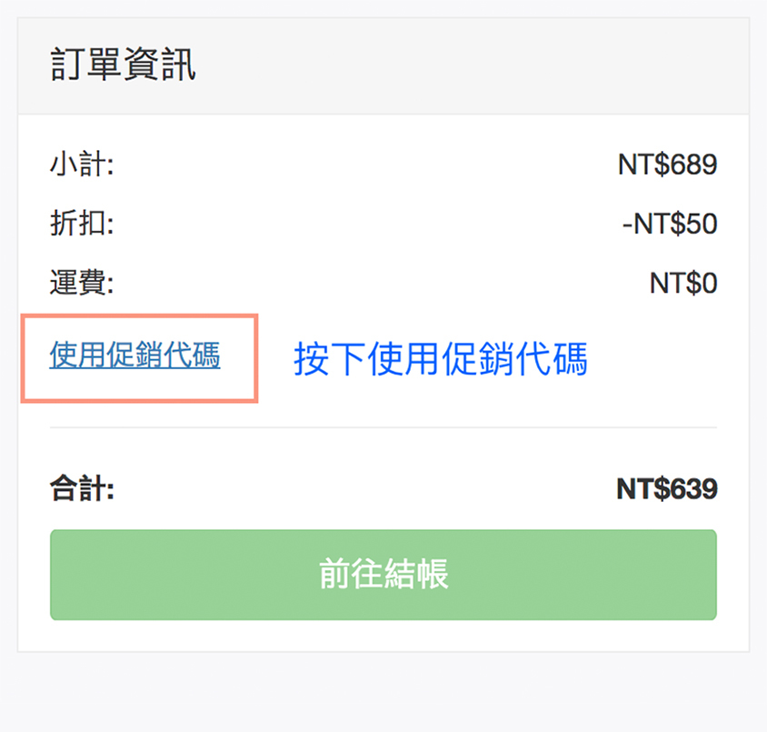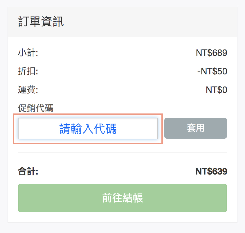 ➤ 優惠代碼請輸入正確位置,若在訂單上備註代碼是『無法』給予折扣,