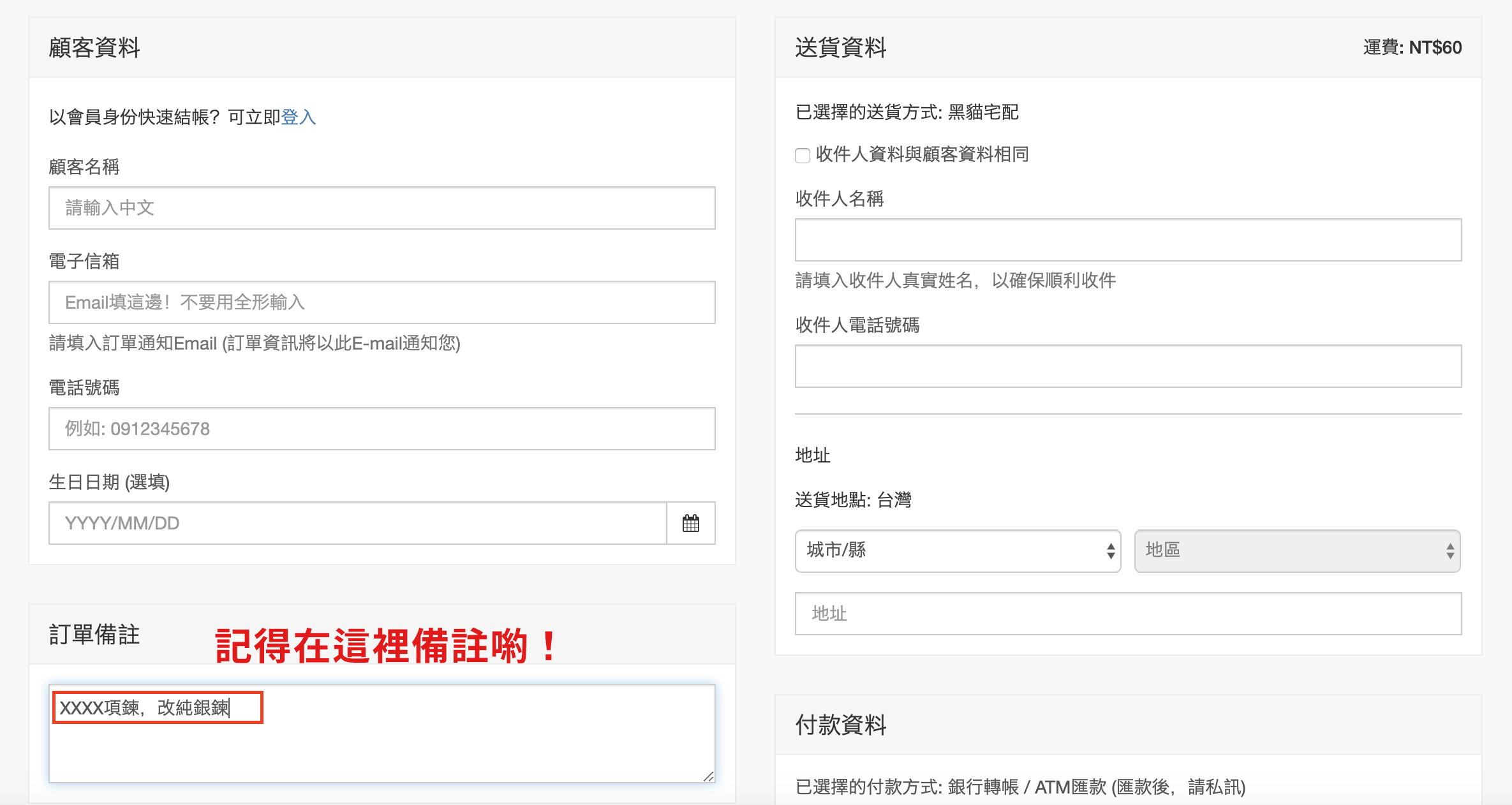 在官網下單時若有加購純銀鍊時記得在訂單備註