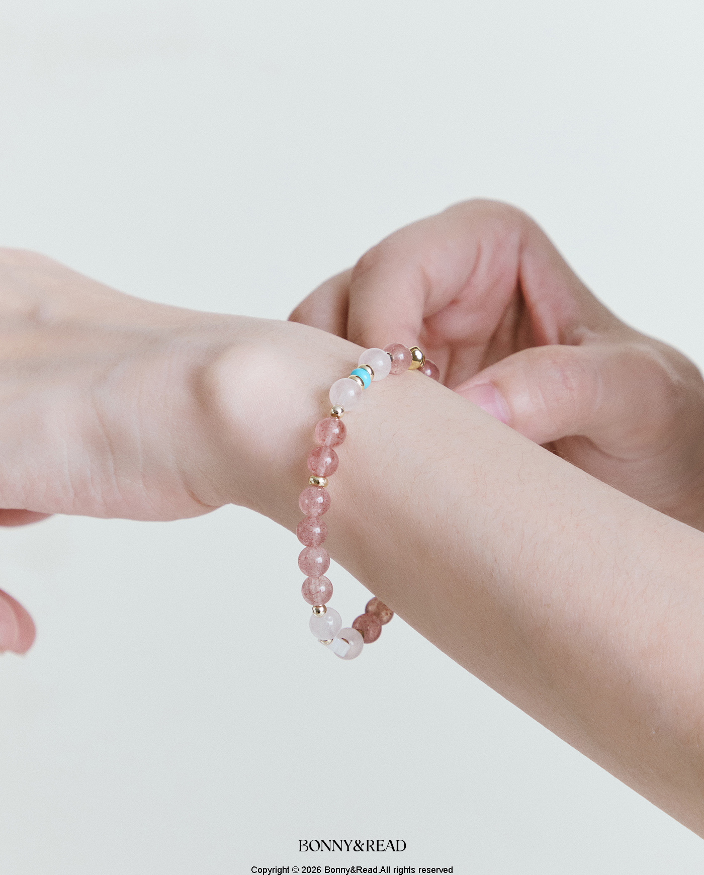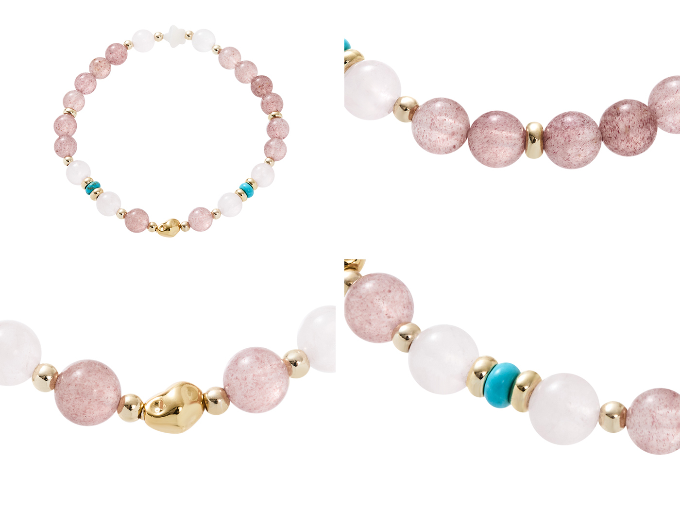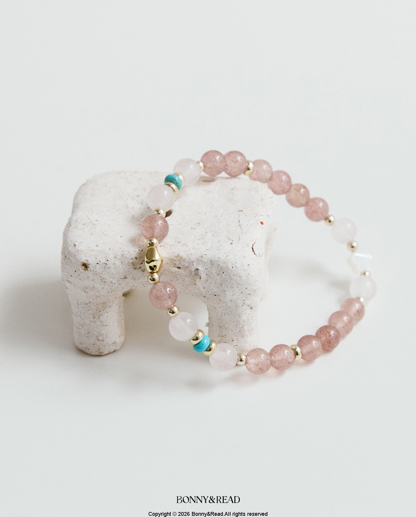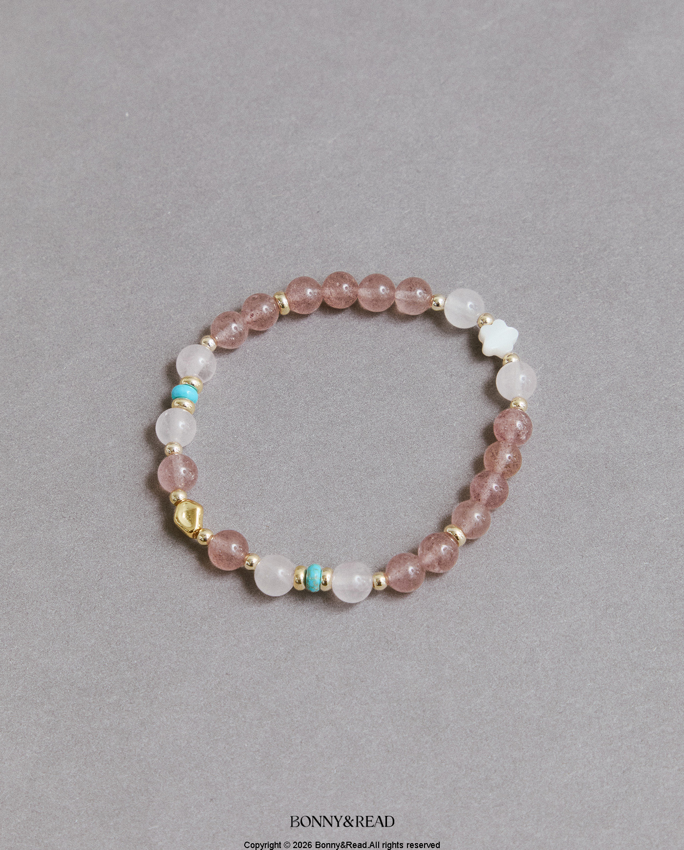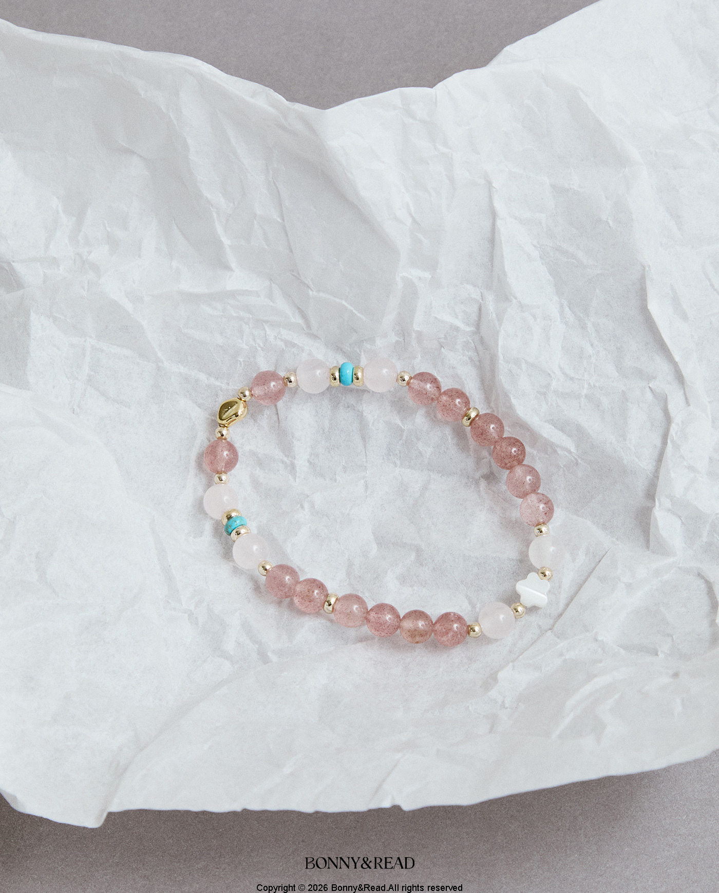 ● 商品材質:草莓晶 / 貝殼 / 粉水晶 / 磷煤礦松石 / 銅 (保色電鍍) / 彈性繩