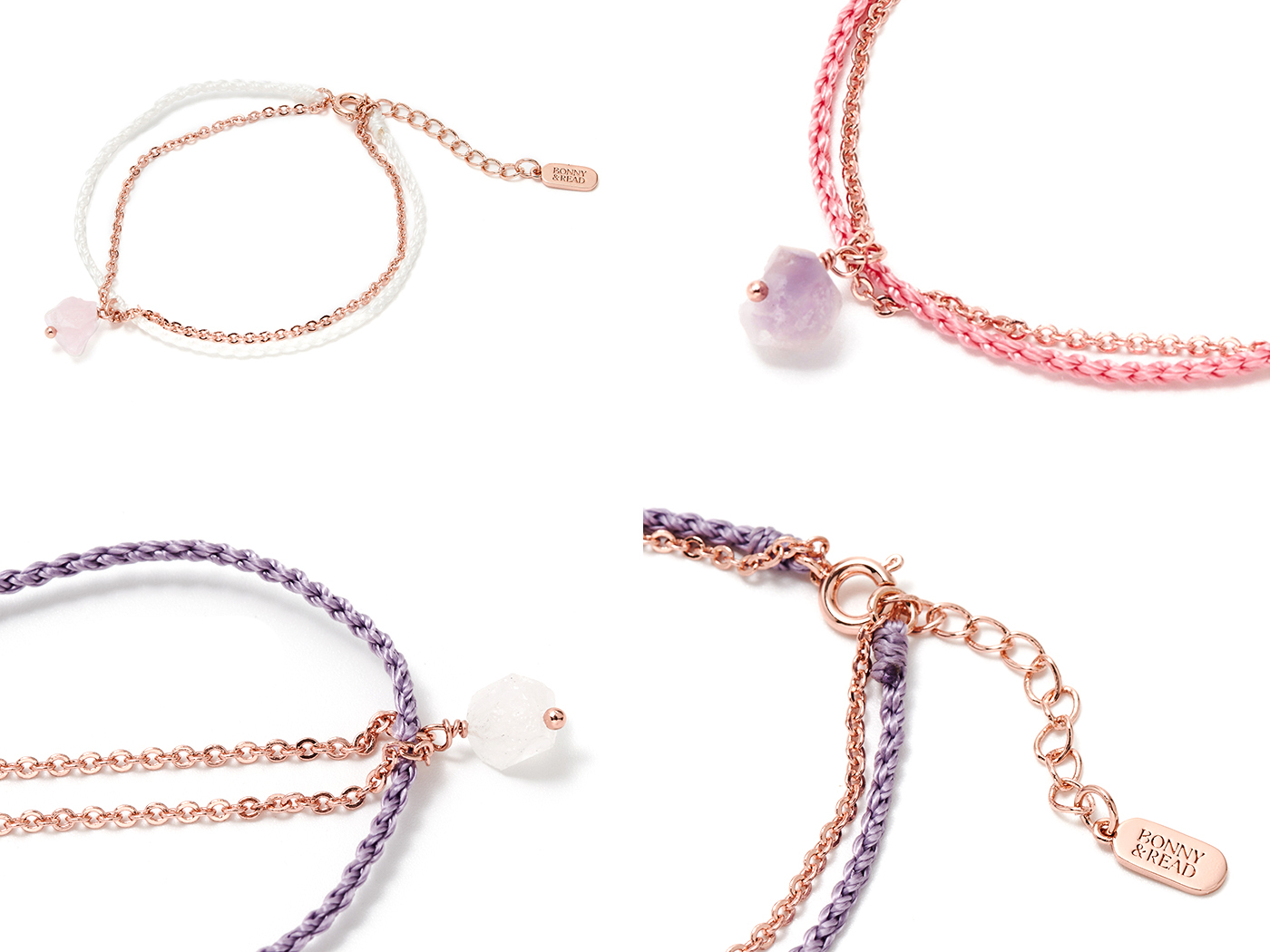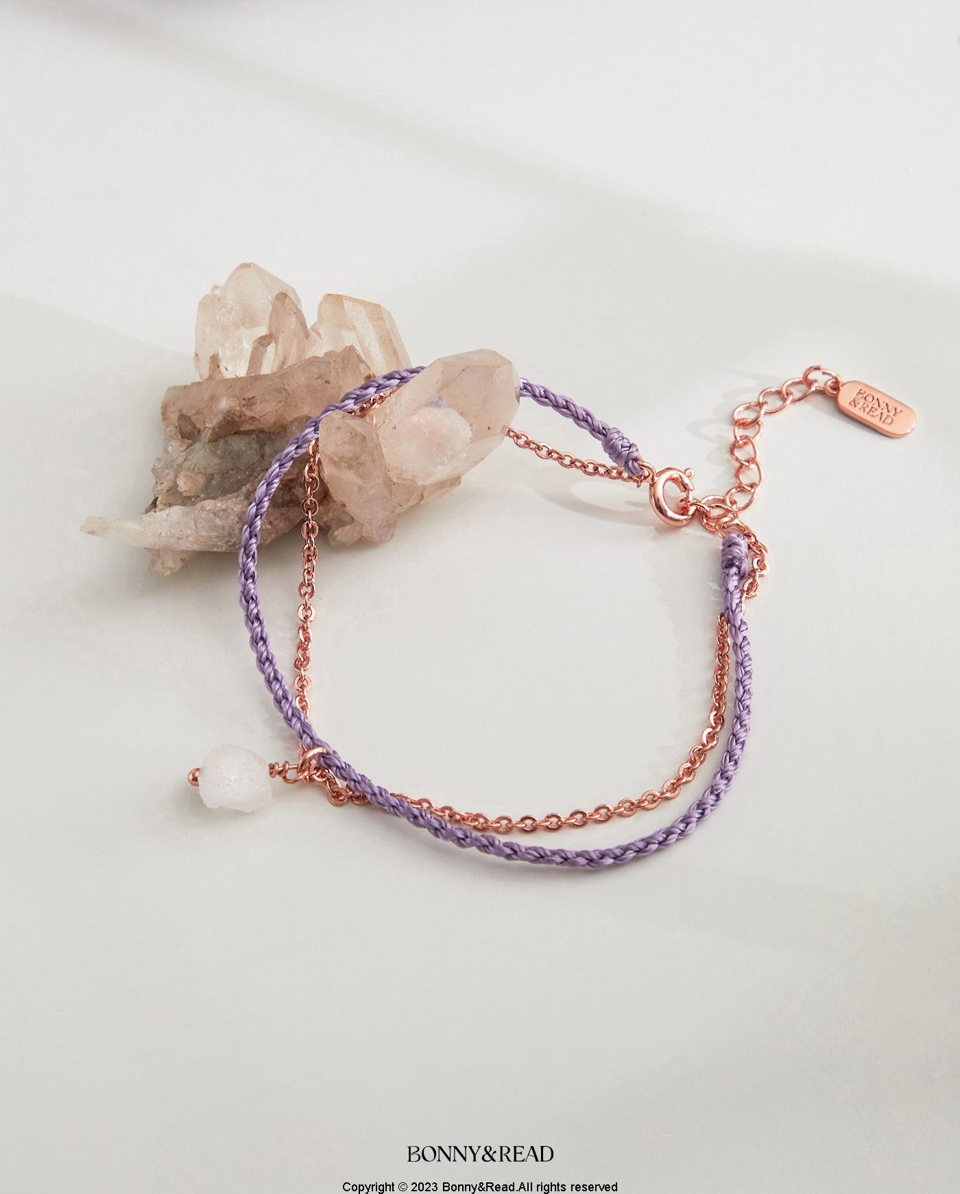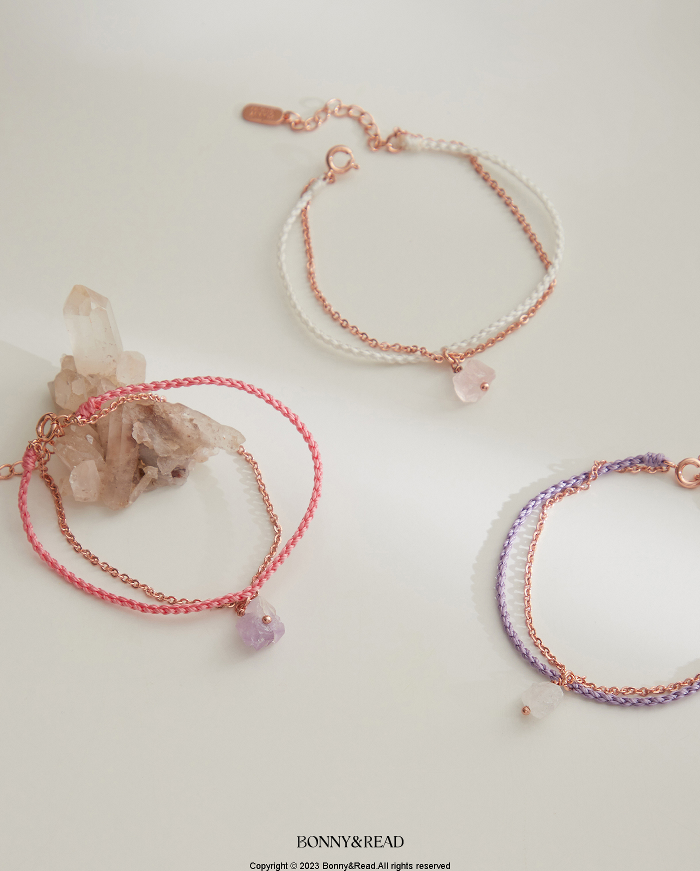 ● 商品材質:銅 (保色電鍍) / 編織繩 / 白水晶 / 粉水晶 / 紫晶花