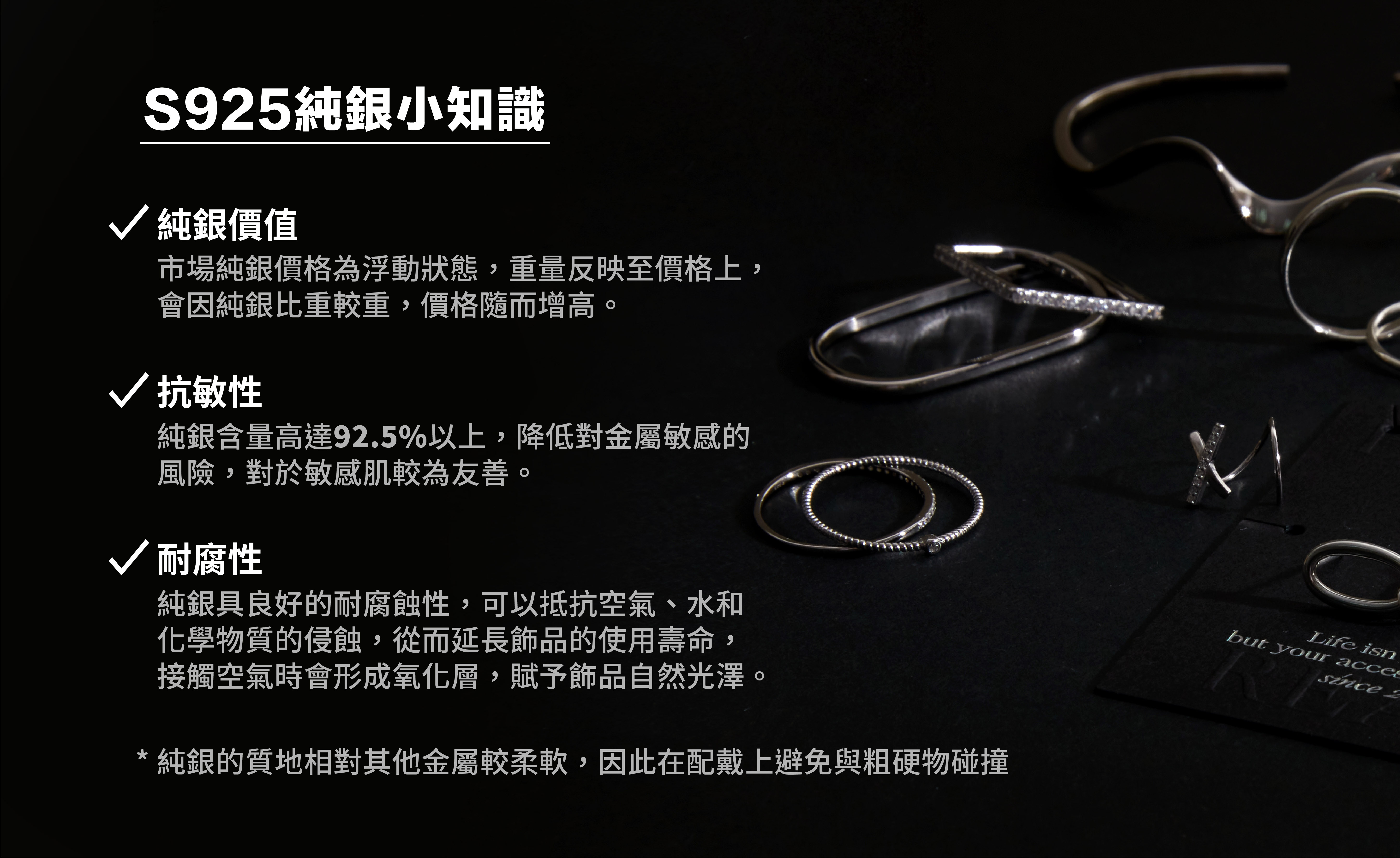 ● 純銀飾品若無佩戴時,請先保持乾燥狀態,再放置飾品盒或是夾鏈袋乾燥陰涼處保存,避免氧化發黑。